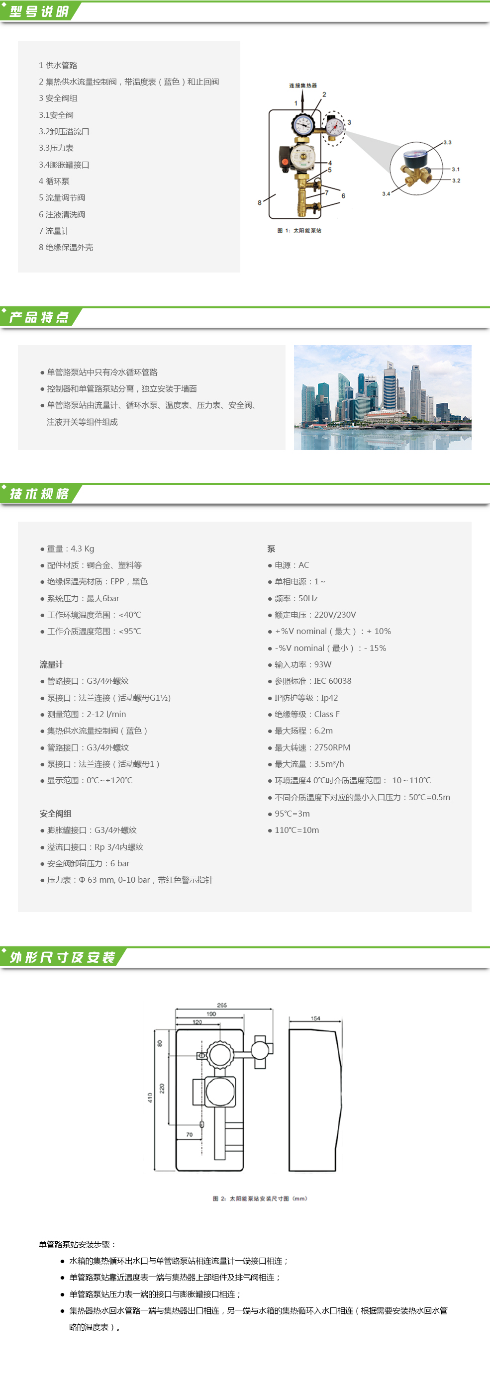 太陽能泵站HL-WS-01 用于分體承壓閉合的太陽能熱水系統(tǒng),安裝于太陽能集熱器的供水管路上,適用于水、水和乙二醇混合物介質,集成的安全閥組用于防止系統(tǒng)壓力過高。太陽能泵站包含功能性部件、安全保護裝置和絕緣保溫殼體;產品經過集成裝配、嚴格的功能測試和密封性檢測。