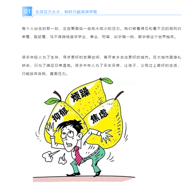 生活的壓力,需要一個宣泄口:或是深夜點上一支煙;或是球場揮汗如雨;或許關上門默默流淚……更多的時候,是低下頭,深呼吸,告訴自己你能行,請堅持。