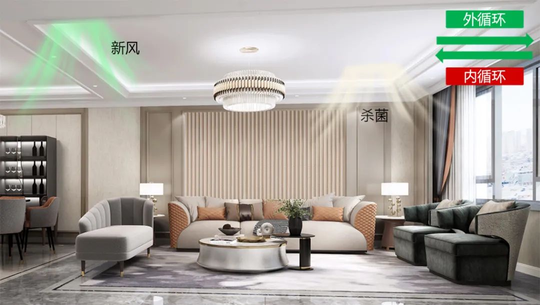 當室內較大顆粒(5~10μm以及大于10μm,通常為飛沫、灰塵、花粉等)指數比較高時,容易讓細菌和病毒長期滯留在室內環境中,系統此時會自動開啟新風凈化設備,通過凈化濾網降低較大顆粒物的存留;