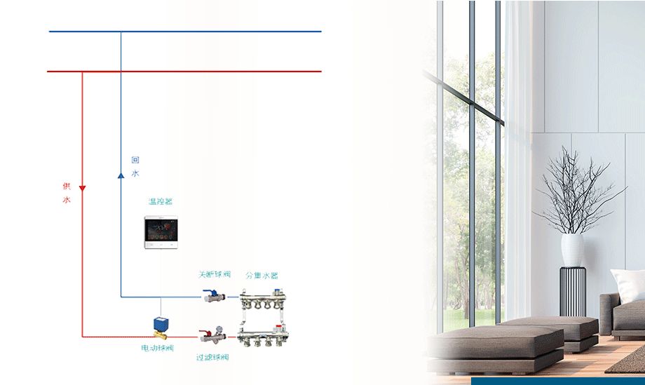 這套系統比較適用于對溫度要求精準的別墅、公寓、寫字樓、住宅等。分集水器上每個控制閥加裝電熱執行器,再由各個區域的溫控器控制,極大程度滿足個性化需求,按需、時智能配置每個房間的溫度,房間獨立恒溫、舒適節能。