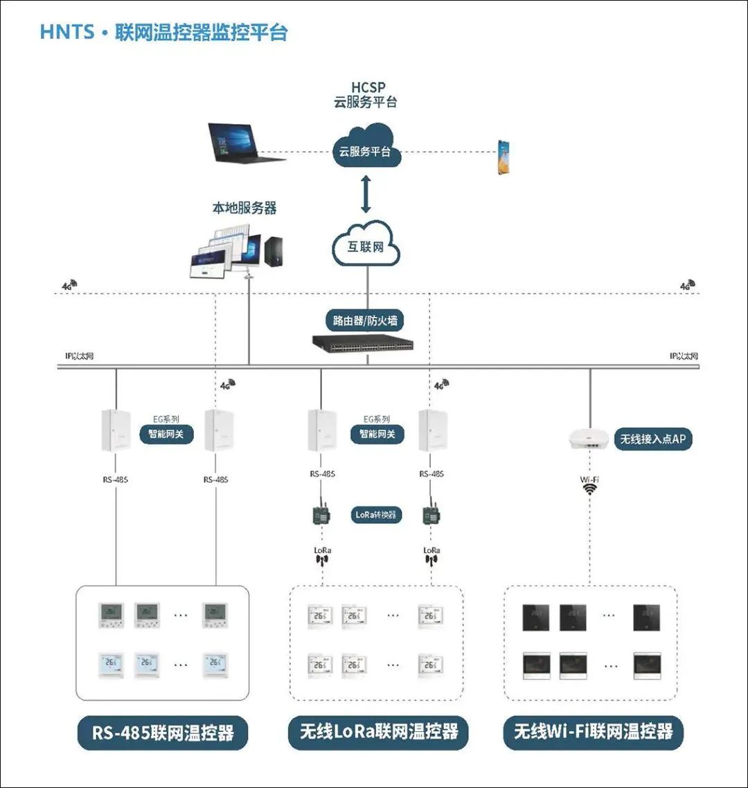 海林HNTS末端溫控器集控系統集自動化控制技術、計算機網絡技術于一體,可同時集中或獨立對多臺末端設備的啟停、水閥的開閉及溫度設置進行控制。有三種聯網集控方式:RS-485 有線方式、 LoRa 無線方式和 Wi-Fi 無線方式。
