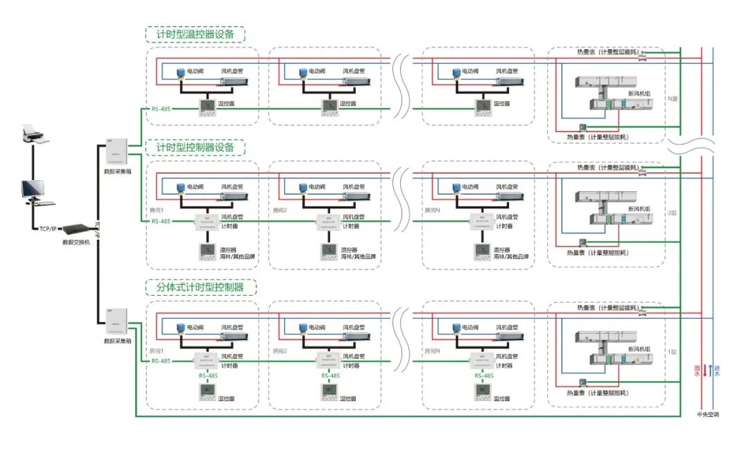 海林HNTS末端溫控器集控系統集自動化控制技術、計算機網絡技術于一體,可同時集中或獨立對多臺末端設備的啟停、水閥的開閉及溫度設置進行控制。有三種聯網集控方式:RS-485 有線方式、 LoRa 無線方式和 Wi-Fi 無線方式。