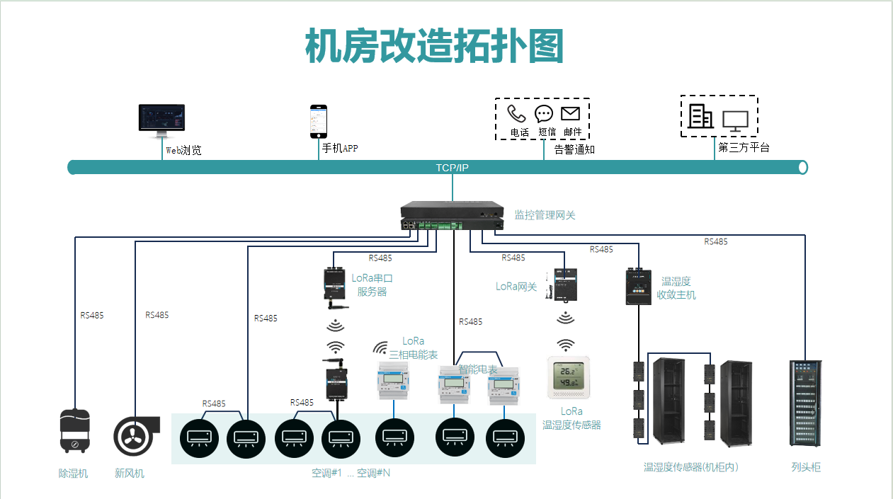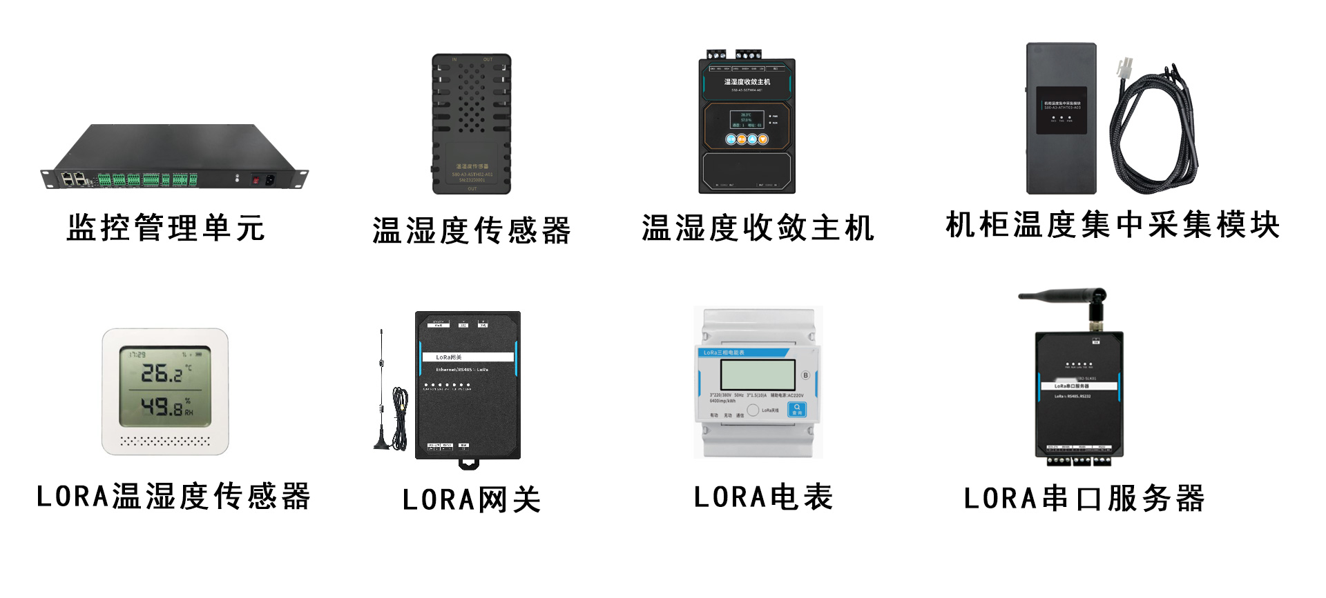 該系統(tǒng)設(shè)備由:監(jiān)控管理單元、溫濕度傳感器/收斂主機、機柜溫度集中采集模塊、LORA傳感器/網(wǎng)關(guān)/電表/串口服務(wù)器組成
