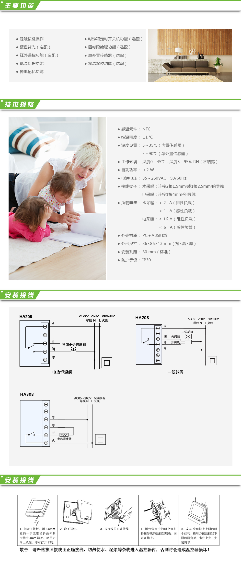 數字溫控器HA208/HA308采用微電腦控制技術,大屏幕液晶顯示,適用于家庭、辦公樓、寫字樓、學校等場所的溫度控制。 HA208用于水采暖系統。 HA308用于電采暖系統。