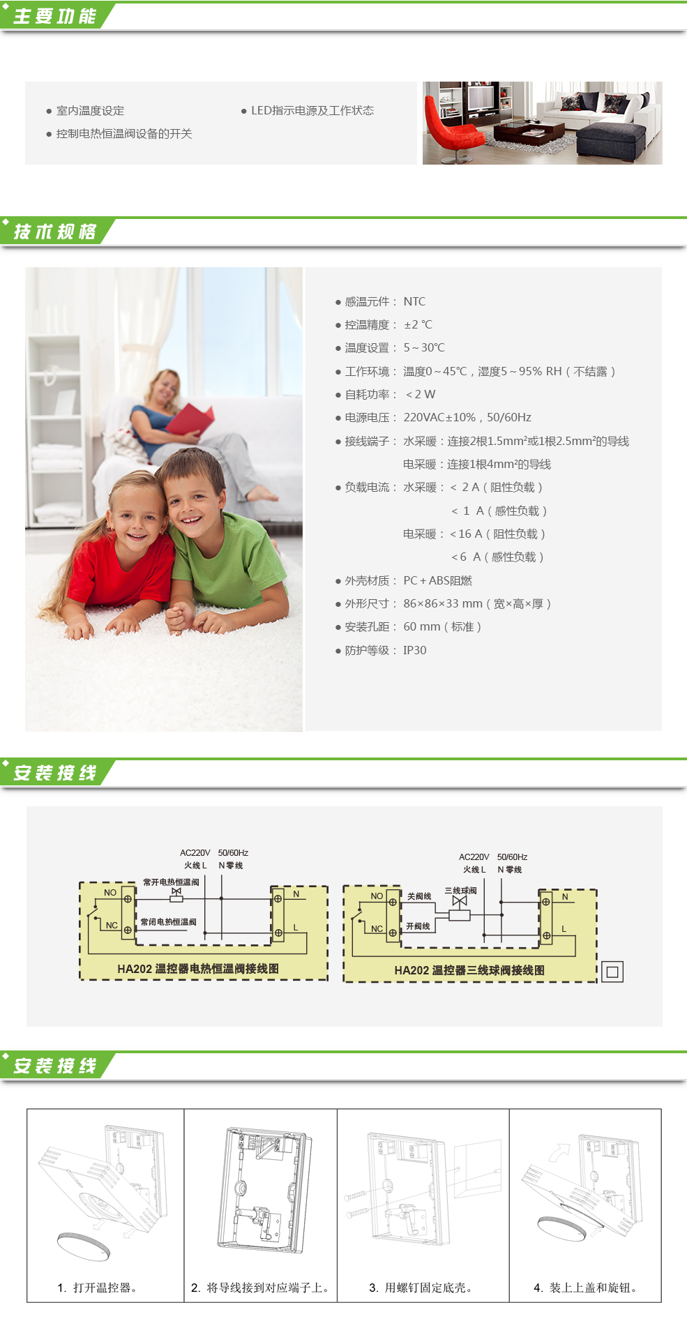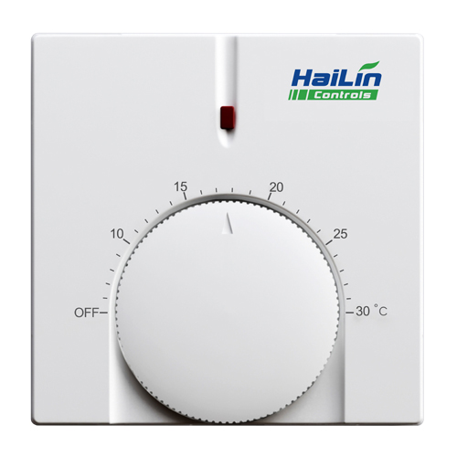 旋鈕式溫控器HA202/HA302是電子式供熱專用溫控器,使用操作簡單便捷,控制設備的啟停。當室內溫度低于設定溫度約2℃時啟動,LED指示工作狀態,LED燈亮(為紅色)。當室內溫度達到設定溫度時關閉,LED燈變為綠色,此時溫控器仍在工作。如果將旋鈕旋到OFF位置,則溫控器斷電,LED燈滅。 HA202 用于水采暖系統。 HA302 用于電采暖系統。