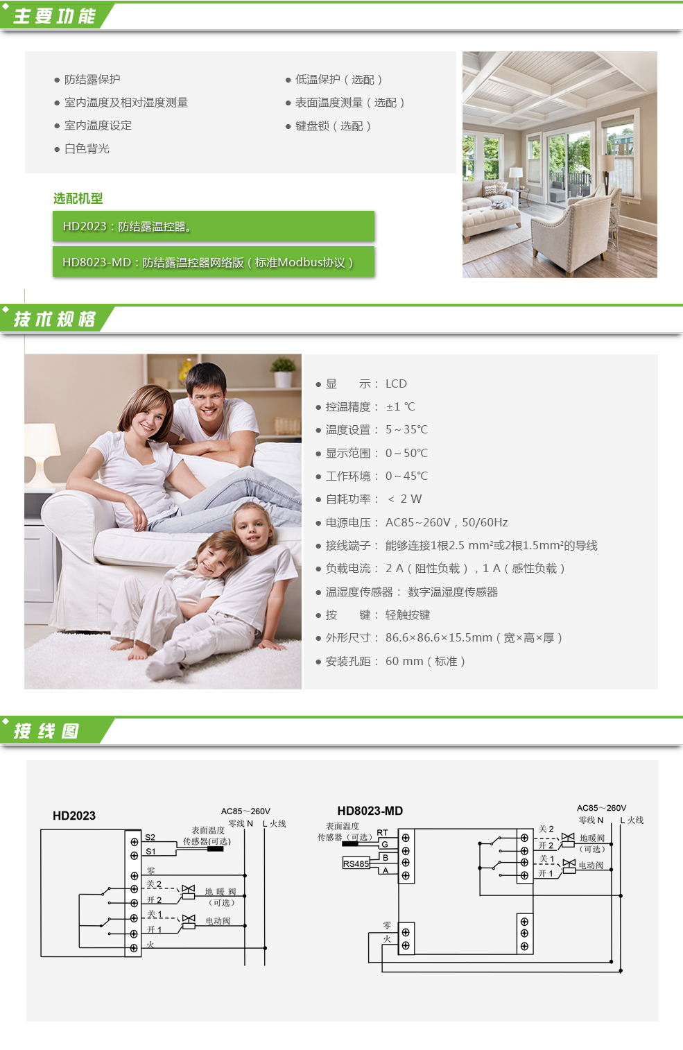防結(jié)露溫控器,適用于家庭、辦公樓、寫字樓、學(xué)校等場所的室內(nèi)溫度控制,具有防止毛細管網(wǎng)在制冷時結(jié)露的功能。采用靈敏的溫濕度傳感器作為感溫元件檢測室內(nèi)溫度,并與用戶設(shè)定的溫度相比較后自動控制電動閥的啟停,以達到室內(nèi)恒溫的目的。